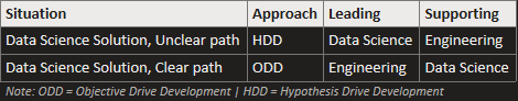 Now we fast forward in time, we've run our experiments, and we have strong signal that we are on the right path. Once you find that path forward the roles of the team switch. Why? We've entered a new stage in the solution development lifecycle. We are no longer experimenting; we have a path and it's time to get after it. At this stage, everyone is focused on implementation. The data scientists are finalizing models and making them robust, they are considering where data lives, how its accessed and what transformations it needs to undergo to be of use. The engineers then shift from building a supporting experimentation platform to building an actual product that transfers value to the end user. The whole team shifts away from HDD to Outcome Driven Development or ODD. Now high performance is about our ability to ship high quality features and functionality at a high rate of speed. The backlog should shift as well from hypothesis and experiments (though you will still see these from time to time) to features and functionality.